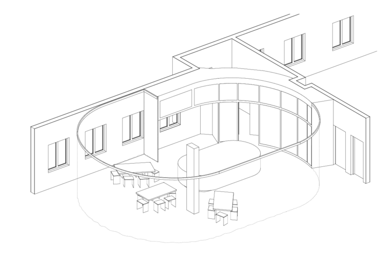 einen ovalen Raum in Raum aufgelockert. Die ovale Form teilt sich in Küchenmöbel und Vorhang auf und Mitten im Zentrum